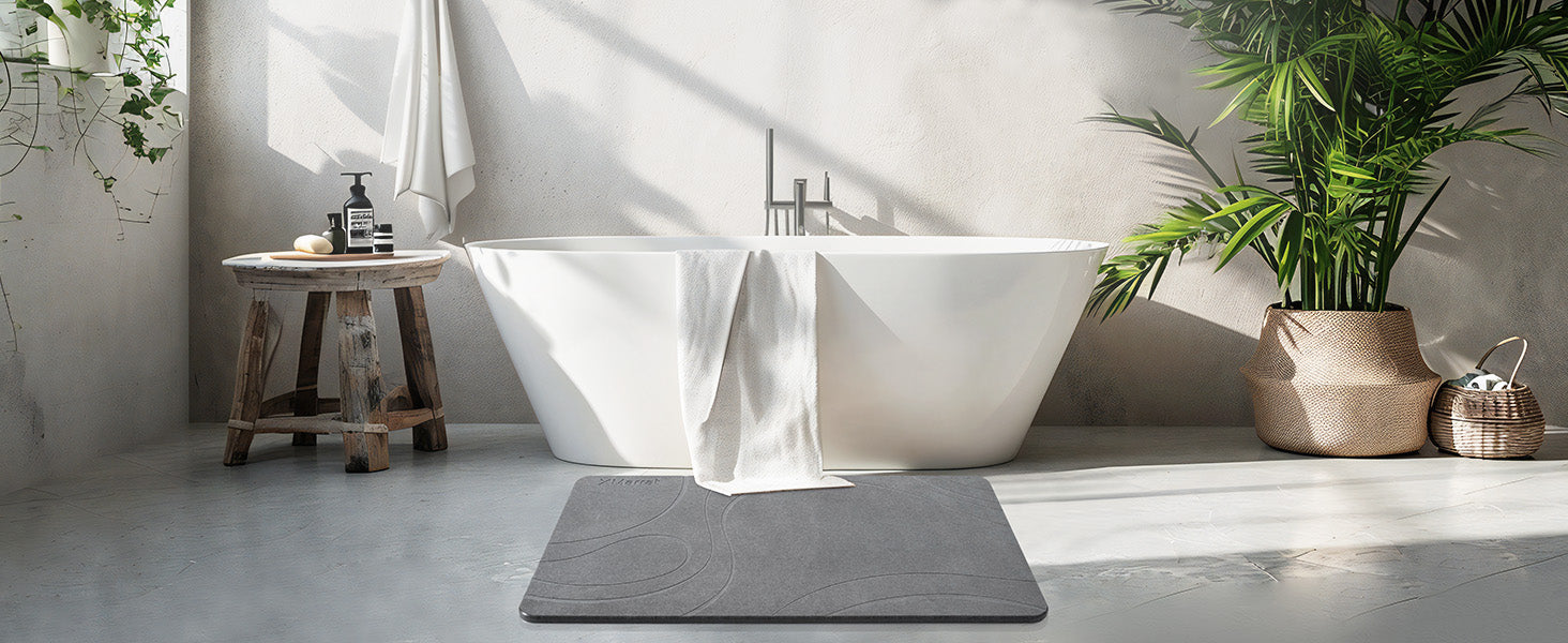 Upgrade your bathroom with Xmarrat’s diatomite bath mat — instant absorption, anti-slip design, and natural style.